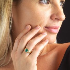 in oro giallo 18kt, al centro uno smeraldo taglio ottagonale di ct 1.30 circa, affiancato da due diamanti taglio trilliant per ct 0.30 circa, punzone 750, mis. 55, gr. 7