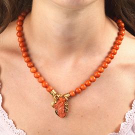 composta da un filo di sfere in corallo di mm 8 circa da cui pende un elemento centrale in corallo inciso raffigurante un volto femminile, punzoni 750 e del fabbricante, lungh. cm 48, gr. 63