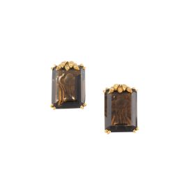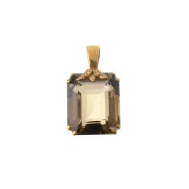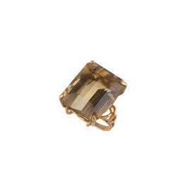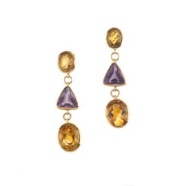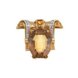in oro giallo 18kt, composta da un paio di orecchini con quarzi fumé taglio ottagonale e diamanti taglio brillante, dim. cm 1,5x2, chiusura a clip con perno; secondo paio di orecchini pendenti con quarzi citrini e ametiste taglio fantasia, lungh. cm 4,5, chiusura a farfallina; un anello con grande quarzo citrino taglio ottagonale, mis. 47, accompagnato da una spilla a volute impreziosita da un grande quarzo citrino sfaccettato insieme a quarzi taglio baguette e diamanti taglio huit huit per ct 0.60 circa, dim. cm 5x4,5, gr. 107 complessivi