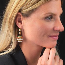 in oro giallo 18kt, decorati in smalti policromi, composti da elementi a campana da cui pendono perle di mm 4 circa, punzone 750, dim. cm 2x4 circa, chiusura a gancio, gr. 28 complessivi