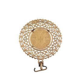 in oro giallo 18kt, a forma di disco traforato recante al centro 20 franchi svizzeri, dim. cm 4x5 circa, gr. 17