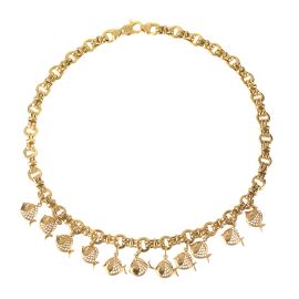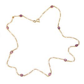 in oro giallo 18kt, di cui due con pendenti a disco e calcedoni, lungh. cm 38 e 50, una con pendenti a forma di pesce, lungh. cm 44, e un'ultima collana impreziosita da rubini taglio ovale, lungh. cm 54, punzoni 750 e del fabbricante, gr. 124 complessivi