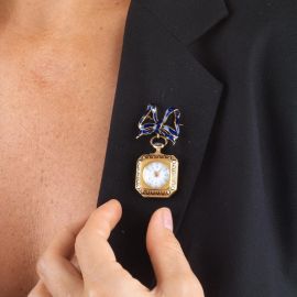 RIBBON BROOCH WITH A WATCH IN 18KT YELLOW GOLD AND ENAMELS