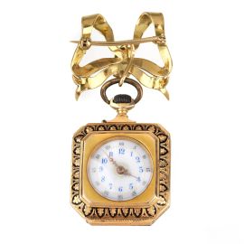 in oro giallo 18kt, a forma di fiocco da cui pende un orologio con cassa in oro giallo 18kt e decorata in smalto, quadrante bianco con numeri arabi, movimento a carica manuale, dim. cm 2,5x5,5, gr. 28