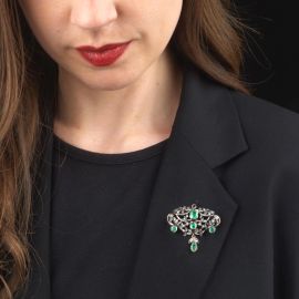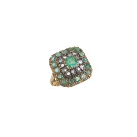 in oro e argento, anello impreziosito da smeraldi taglio rotondo e rose di diamante per ct 0.80 circa, al centro uno smeraldo taglio ottagonale di ct 0.40 circa, mis. 52, accompagnato da una spilla a tralci con smeraldi taglio rotondo e fantasia per ct 1.40 circa e rose di diamante, dim. cm 4x3,5, gr. 14 complessivi