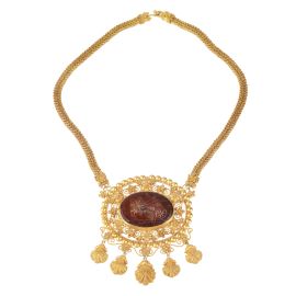 in oro giallo 18kt, composta da catena e grande pendente traforato e microgranulato, recante al centro una pietra dura con motivo figurato, lungh. cm 46, gr. 86