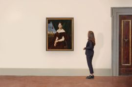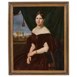 La tela qui presentata, passata a un’asta di Pandolfini nel 1985 come un quadro di anonimo del XIX secolo e con il titolo Ritratto di donna con sfondo di paesaggio, fu dipinta nel 1834 da Giuseppe Bezzuoli, il maggiore rappresentante della pittura romantica toscana, noto soprattutto per quadri di tema storico e maestro di pittori come il macchiaiolo Giovanni Fattori (1825-1908). La nobile giovane ritratta, elegantemente abbigliata secondo la moda del tempo, è seduta di tre quarti e fissa lo sguardo sull’osservatore mostrando il volto dai tratti morbidi, rotondi, che inquadrano gli occhi di celeste intenso. La veste, di velluto rosso, contrasta con la tenda verde alle sue spalle la quale incornicia una bella veduta di Firenze illuminata dagli ultimi raggi di un sole che tinge di toni rosati il cielo su cui si stagliano l’elegante profilo di Palazzo Vecchio, la cupola del Duomo e le morbide vette appenniniche sullo sfondo. Il nostro ritratto anticipa nella composizione quello illustre dipinto da Bezzuoli due anni dopo a Maria Antonietta di Borbone (1814-1898), granduchessa di Toscana e seconda moglie del granduca Leopoldo II (1797-1870), oggi conservato alla Galleria d’Arte Moderna di Palazzo Pitti a Firenze. La posa delle due donne è infatti la stessa (Maria Antonietta è ritratta per intero, in compagnia del fedele cane), così come l’idea di inserire le ritratte all’interno di uno spazio chiuso ed elegante sullo sfondo di un grande tendone in parte aperto sull’amata città di Firenze, osservata, in entrambi i casi, dal medesimo punto di vista e nella stessa ora del giorno. Si tratta dunque, anche nel nostro caso, di un’immagine impostata nel rispetto di un impianto scenografico e compositivo tipico di quel Romanticismo internazionale che andava affermandosi a Firenze alla metà degli anni Trenta del secolo. Un impianto scenografico, quello, che, come sottolinea Vanessa Gavioli analizzando ritratti coevi al nostro nel catalogo della mostra dedicata recentemente a Bezzuoli a Palazzo Pitti, è «specchio di una società confortata dagli agi e dagli svaghi dell’intelletto»; di «una nobiltà il cui principale regno era la casa, dove si intratteneva confortata dal calore degli affetti familiari» (Gavioli 2022, p. 215).