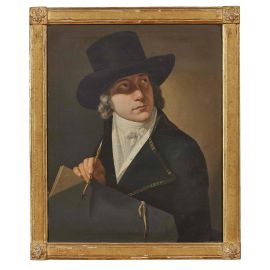 Lo sguardo rivolto curiosamente verso l’alto, l’elegante cappello da cui spuntano ordinati riccioli, la cravatta inamidata e inappuntabilmente bianca , l’ordinata cartella, ove sono racchiusi schizzi e studi, su cui si adagia la mano che impugna il pennello a identificare l’attività dell’artista, protagonista protagonista del ritratto che presentiamo in questa vendita.