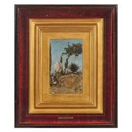La bella tavoletta di Silvestro Lega che presentiamo in catalogo, opera inedita, è allineata alla pittura en plein air, ben assimilata dagli artisti della “macchia”. Non sappiamo però chi sia, tra gli amici pittori, colui che Lega ritrae affettuosamente al lavoro, seduto accanto ad un muretto al riparo del sole , sullo sfondo di un inconfondibile paesaggio toscano.