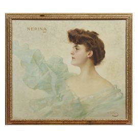 Il bel profilo di donna presentato in catalogo potrebbe certo essere annoverato tra le fanciulle «che hanno in sé qualcosa del fantasma e del fiore» (Cfr. G. Menasci, Vittorio Corcos, ritrattista, in “Fanfulla della Domenica”, 18 Febbraio 1894, p.3). Datato 1903, Nerina mostra un’affinità con opere quali il nobile profilo di Ada (1902) o Adriana (1897), con cui condivide anche l’elegante inserimento del nome in alto, ove i toni pastello cullano lo spettatore in una dolcezza onirica. Il serico incarnato è accarezzato da una luce soffusa e la chioma vaporosa orna il capo di Nerina mentre il velo, complice un’irreale brezza, si presta a un gioco decorativo che sembra evocare il profumo di un lilium appena schiuso.