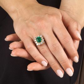 in oro giallo 18kt, impreziosito al centro da uno smeraldo brasiliano taglio ottagonale di ct 2.85 circa, circondato da una fila di diamanti taglio brillante per ct 1.80 circa, colore H, purezza Vs/SI, punzone 750, mis. 54, gr. 8. Corredato di certificato IGN del 07/09/2022 attestante le caratteristiche e l'origine della pietra.