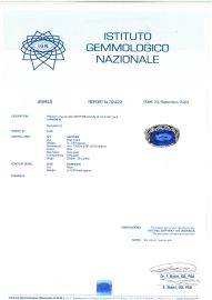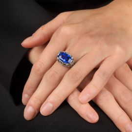 in platino, con fascia traforata raffigurante un motivo a fiocchi impreziosita da rose di diamante per ct 0.90 circa, recante al centro uno zaffiro ceylon taglio ovale di ct 7.80 circa, mis. 57, gr. 6. Corredato di certificato IGN del 23/09/2022 attestante l'origine della pietra e l'assenza di trattamenti termici.