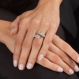 in oro bianco 18kt, con agli apici due diamanti taglio princess per ct 2.40 circa, colore M/N, purezza Vs, affiancati da pavé di diamanti taglio brillante per ct 0.80 circa, colore H/I, purezza Vs/SI, punzone 750 e del fabbricante, mis. 54, gr. 11. Corredato di certificato IGN del 12/07/2022 attestante le caratteristiche.