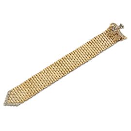 in oro giallo e bianco 18kt, realizzato a maglia morbida con fermatura a fibbia impreziosita da diamanti taglio brillante e huit huit per ct 2 circa, punzone 750, lungh. cm 24, gr. 83