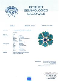 in oro giallo 18kt e platino, impreziosita al centro da uno zaffiro taglio cuscino di ct 1.70 circa circondato da una fila di diamanti taglio brillante per ct 0.85 circa, colore F/G, purezza IF/Vvs, con petali cosparsi di turchesi taglio cabochon per ct 2 circa, firmata "Cartier Paris", punzoni francesi e numero seriale, dim. cm 4x4, gr. 22. Corredata di certificato IGN del 17/06/2022 attestante le caratteristiche e l'assenza di trattamenti termici sullo zaffiro.