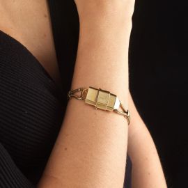 cassa in oro giallo 18kt realizzata in Francia, corona di carica posta sul fondello a cerniera in oro giallo recante personalizzazone, quadrante a scomparsa dotato di coperchio scorrevole in oro giallo 18kt recante cervo inciso, punzoni francesi, quadrante bianco, grafica nera, numeri arabi stampati, movimento a carica manuale, bracciale a due fili in maglia tubolare in oro giallo 18kt con chiusura a scomparsa, n. seriale 250XX, gr. 35. Dim. mm 16x25