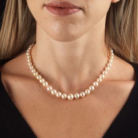 ad un filo di perle naturali digradanti di mm 3.90/9.50 circa, fermatura in platino con diamanti taglio baguette per ct 1.30 circa e tre diamanti taglio rotondo per ct 0.40 circa, lungh. cm 38, gr. 25. Corredata di certificato IGN del 18/10/2022 attestante le caratteristiche.