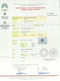 di ct 2.73, taglio brillante, colore J, purezza Vvs1. Corredato di certificato CISGEM del 22/07/2003 attestante le caratteristiche.