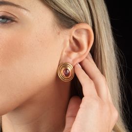 in oro giallo 18kt, a forma di dischi con scanalature, recanti al centro due tormaline rosa taglio cabochon di mm 10x8x5 circa, firmati "Petochi", punzoni 750 e del fabbricante, dim. cm 2x2 circa, chiusura a clip, gr. 20 complessivi