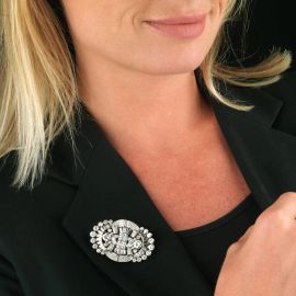 in oro 14kt e platino, realizzata seguendo un motivo a volute, impreziosita da diamanti taglio vecchio e baguette per ct 6.60 circa, dim. cm 5x3,5, scomponibile in due clips di cm 3,5x2,5, punzoni austriaci dell'oro e del platino, gr. 32 complessivi