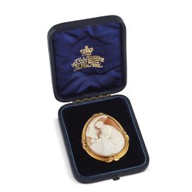 in oro a basso titolo, di forma ovale, recante al centro un cammeo su conchiglia con scena figurata, dim. cm 4,5x5,5, gr. 21. Corredata di scatola.