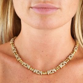 in oro giallo 18kt, composta da una serie di maglie concatenate impreziosite da diamanti taglio brillante (uno mancante) per ct 10 circa, firmata "Ventrella Roma", lungh. cm 45, gr. 105