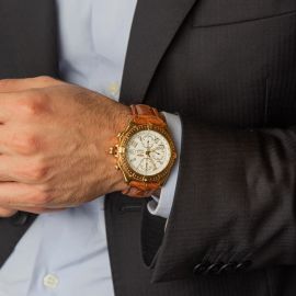 cassa in oro giallo 18kt, fondello a vite marcato Breitling, tasti del cronografo a pompa, lunetta girevole in oro giallo, quadrante bianco guilloché con scala tachimetrica, numeri romani applicati, datario a ore tre, contatore dei secondi a ore nove, contatore dei minuti a ore dodici, contatore delle ore alle sei, movimento a carica automatica cal. ETA 7750, cinturino originale in pelle marrone, fibbia in oro giallo 18kt marcata Breitling, vetro minerale, gr. 140. Diam. mm 38. Corredato di scatola e garanzia.