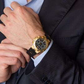 cassa in oro giallo 18kt, ghiera girevole in oro giallo 18kt, tasti a vite, quadrante nero, grafica bianca, numeri arabi e indici bicchierini applicati, contatore dei secondi a ore tre, contatore dei minuti a ore nove, movimento a carica automatica, bracciale in gomma da sostituire, fibbia doppia deployant in oro giallo 18kt marcata Bulgari, vetro minerale, gr. 145. Diam. mm 38