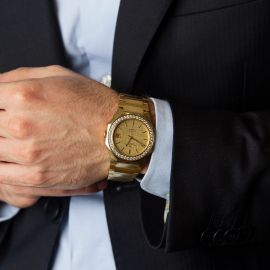 cassa ottagonale in oro giallo 18kt, fondello serrato a vite, corona marcata, ghiera con diamanti applicati successivamente, quadrante champagne, grafica nera, indici applicati, datario a ore tre, movimento a carica automatica cal 3254 n. 2282307, bracciale a maglie in oro giallo 18kt, lungh. interna cm 21 circa, chiusura deployant a scomparsa in oro bianco 18kt, vetro minerale, gr. 185. Diam. 41