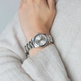 cassa in acciaio, fondello serrato a vite, lunetta liscia in acciaio, corona marcata, quadrante argenté, grafica nera, numeri arabi e indici applicati di colore rosa, movimento a carica automatica cal 2231 n. 64R311G1, bracciale oyster in acciaio ref. 70160 finali M3L, lungh. interna cm 18, chiusura a scatoletta in acciaio marcata Rolex, vetro minerale. Diam. mm 31