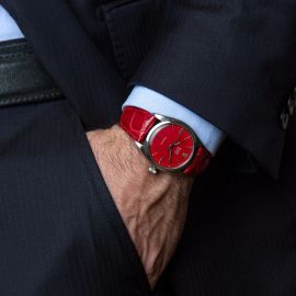cassa in acciaio, fondello a vite, corona marcata, lunetta in acciaio, quadrante rosso ristampato, grafica bianca, indici applicati con trizio, movimento a carica automatica cal 1210 n. 49991, cinturino in pelle rossa, fibbia in acciaio marcata Rolex, vetro plastica bombato. Diam. mm 35