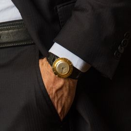 cassa in oro giallo 18kt, fondello a pressione, lunetta a scalino su base a disco, quadrante argenté, movimento a carica manuale cal 800, cinturino non originale in pelle nera lucida, fibbia in metallo dorato, vetro plastica bombato, gr. 18. Diam. mm 38