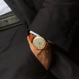 cassa in oro giallo 18kt, fondello a pressione recante personalizzazione "Cotonificio Honegger 15/1/1920 - 15/1/1950", anse a goccia, quadrante argenté, numeri romani e indici applicati di color oro, movimento a carica manuale cal P454/5C n. 475423, cinturino non originale in pelle marrone, fibbia in metallo dorato, vetro plastica, gr. 41. Diam. mm 35