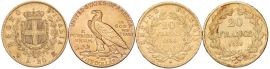 20 lire 1863; 20 franchi 1839, 1858; 5 dollari indiano 1911