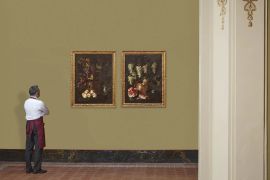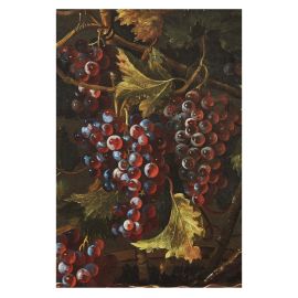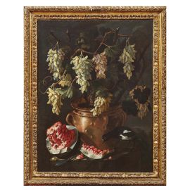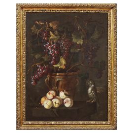 BLACK GRAPES IN A VASE WITH PEACHES AND A BIRD