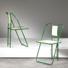 FOLDING CHAIRS, GREEN LACQUARED METAL STRUCTURE, PLASTIC MATERIAL