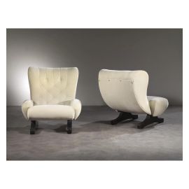 A PAIR OF ARMCHAIRS, WOODEN STRUCTURE, WHITE FABRIC UPHOLSTERY