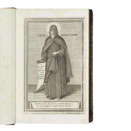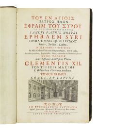 PRIMA MONUMENTALE EDIZIONE COLLETTIVA, curata da Giuseppe Simone Assemani, delle opere di Efrem il Siro (306-373), teologo e scrittore fra i più antichi in lingua siriaca, e il più importante fra essi. Venerato come santo dai cristiani del mondo intero, ha scritto moltissimi inni, poesie e omelie in versi e commentari biblici in prosa. L’originale siriaco rimase sconosciuto in Europa fino ai fruttuosi viaggi in oriente di Giuseppe Simone Assemani (1687-1768), bibliotecario, orientalista e arcivescovo cattolico libanese naturalizzato italiano, che si conclusero con la scoperta di una preziosa raccolta di manoscritti nel monastero di Nostra Signora a Nitria (Egitto), i quali trovarono poi la loro collocazione presso la Biblioteca Vaticana. Assemani propose subito a Papa Clemente XII un’edizione completa delle opere di Efrem nell’originale siriaco e nella versione greca, con una nuova versione latina dell’intero materiale. Egli curò il testo greco, mentre quello siriaco fu affidato al gesuita Pietro Mobarak (Benedetto), in quanto maronita. Dopo la morte di Mobarak, i suoi lavori furono continuati da Stefano Evodio Assemani. Alla fine l’edizione dell’opera di Efrem fu pubblicata a Roma (1732-1746) in sei volumi in folio, in mille copie per ogni volume. Per finanziare la stampa dei volumi il cardinale Angelo Maria Querini (1680-1755), bibliotecario della Vaticana, utilizzò per diversi anni i fondi destinati all’acquisto di nuovi volumi della biblioteca, donando in cambio alla stessa il suo ricco patrimonio librario personale. Nel lotto anche Ephraem Syrus. Ta tou osiou patros Ephraim tou Syrou ten Hellada metablethenta S. Ephraim Syrus, graece. E Codicibus Manuscriptis Bodleianis. Oxonia, (1709), un volume in folio (390 x 242 mm), mezzo vitellino verde coevo, dorso liscio con gradevoli decorazioni dorate, timbri al frontespizio, bruniture.