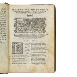 BELLA EDIZIONE GIOLITIANA DELL’ORLANDO, secondo Gamba 53 “la più bella, la più rara e la più stimata di ogni altra”. Pubblicato per la prima volta nel 1516, e poi nel 1521, con correzioni dell’autore, e infine nel 1532, edizione definitiva, l’Orlando ebbe molte ristampe; della presente esiste una tiratura nella quale la vignetta al Canto Ventesimosecondo, alla carta 114, è diritta (come nel nostro caso); altra nella quale è rovesciata.