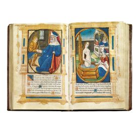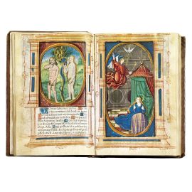 Germain Hardouyn fu un prolifico tipografo, libraio ed editore attivo a Parigi dal 1500 al 1541, inizialmente con il fratello Gillet o Gilles. I due Hardouyn fornirono al mercato parigino e alla provincia un gran numero di libri d’ore a stampa, pubblicazioni tipiche degli editori e tipografi di Parigi nel Rinascimento: ne furono prodotte innumerevoli edizioni tra il 1488 e il 1568. La nuova tecnologia di stampa si sostituì infatti al lungo lavoro di copisti e miniaturisti, consentendo di creare multipli che potevano raggiungere un pubblico più ampio. La crescente classe media urbana fu uno dei principali acquirenti di questo tipo di libri, belli come i preziosi manoscritti che venivano creati per le classi nobili. Sebbene alcuni libri d’ore a stampa fossero lasciati in bianco e nero, molti ebbero le loro illustrazioni sontuosamente dipinte a mano, come nel presente caso. Gli artisti che le coloravano erano spesso attivi anche come miniatori tradizionali, rendendo difficile distinguere le illustrazioni da quelle che si trovavano nei manoscritti. Poiché i due Hardouyn, oltre che come tipografi, erano registrati anche come miniatori, cosa rara nel commercio di libri, i loro libri d’ore a stampa sono spesso eccezionalmente ben dipinti, del tutto simili a manoscritti miniati. Il presente esemplare ha una colorazione vivace e accuratissima, illuminata da eleganti rifiniture dorate. Datato 1533 al colophon, reca tuttavia alla carta A4v l’almanacco per gli anni 1520-1532. L’opera si apre con il frontespizio, decorato dalla grande marca tipografica di Hardouyn, al verso del quale troviamo un Uomo Anatomico scheletrico con agli angoli altre quattro piccole miniature relative ai quattro temperamenti medioevali. Le altre illustrazioni a piena o a tre quarti di pagina rappresentano per lo più scene della vita della Vergine Maria (Annunciazione, Natività, Annuncio ai Pastori, Adorazione dei Magi, Presentazione al Tempio, Fuga in Egitto, Crocifissione, Pentecoste), ma anche scene bibliche come Adamo ed Eva con il Serpente sotto all’Albero della Conoscenza, e Davide e Betsabea. Le dodici miniature più piccole sono altrettanto curate: si confronti l’Arcangelo Michele della presente copia con quello dell’esemplare conservato al Met di New York: