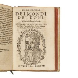 Copy in a, elegant contemporary binding of this Vicenza edition of Doni’s Mondi, published for the first time in 1562. A work of bizarre dialogues, in which Doni expounds the utopia of an anarchist-communist society ordered according to Thomas More’s Utopia and with reminiscences of the Platonic Republic. A few defects. Detailed description, condition report and additional images upon request.