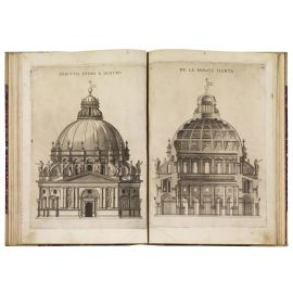 In folio (390 x 268 mm). Segnatura: [1]4 χ1 (la carta χ1 è inserita fra le tavole 31 e 33). Iniziali xilografiche, carattere romano. Frontespizio architettonico calcografico, tre carte in romano numerate 2-4, e 26 tavole calcografiche numerate: 5-31, 33-36 (le tav. 7-8, 9-10, 23-24 sono doppie, la tav. tripla numerata 29-30-31). Mezza pergamena di fine Ottocento con tassello in marocchino rosso al dorso, piatti e sguardie marmorizzate, tavole rimontate all’epoca. -- Frontespizio e tavole molto pallidamente brunite, deboli aloni e tracce d’uso ai margini, strappo restaurato al verso della tavola 21 e altre tracce del tempo.