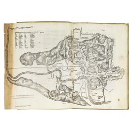 Prima edizione illustrata del più importante trattato sulla topografia di Roma fino al XVIII secolo. Stampato per la prima volta in ottavo da Antonio Blado a Roma nel 1534, nello stesso anno uscì una seconda edizione pubblicata da Gryphius a Lione. La grande pianta dell’antica Roma fu la prima ad essere scientificamente disegnata in termini icnografici e orografici. Altre illustrazioni includono una statua di Ercole attribuita a Fidia e una prima rappresentazione del gruppo Laocoonte. L’opera si apre con la dedica dell’autore a Francesco I di Francia, e prosegue con un elenco alfabetico degli edifici della città, e con le origini e la storia urbanistica di Roma dal primo nucleo, alle porte, archi, templi, statue - inclusi acquedotto, colli, ecc. Bartolomeo Marliani, noto anche come Giovanni Bartolomeo Marliano (1488-1566), è stato un archeologo, topografo, antiquario e umanista italiano.
