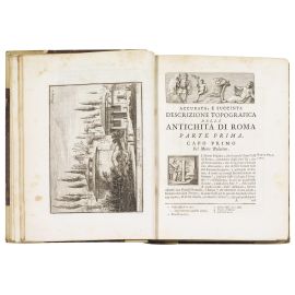 Una delle più rilevanti ed esaurienti opere sulla topografia romana antica e moderna di Ridolfino Venuti, fra i maggiori archeologi del XVIII secolo, tra i fondatori della prestigiosa Accademia Etrusca di Cortona. Sia il primo che il secondo volume sono completi delle molteplici e belle tavole incise a piena pagina, tra cui una pianta di Roma antica ripiegata più volte, di cui diverse firmate da Giovanni Battista Piranesi.
