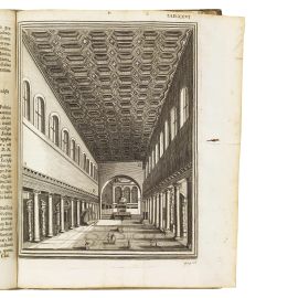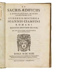 PRIMA EDIZIONE di questa opera del Ciampini sugli edifici sacri fatti costruire dall’imperatore Costantino il Grande. Oltre alle principali chiese romane (Basilica Lateranense, Basilica Vaticana, S. Paolo, S. Lorenzo, ecc.) vengono descritte chiese di Ravenna, Gerusalemme, Costantinopoli, ecc. “Giovanni Giustino Ciampini (1633-1698), importante antiquario, storico della Chiesa e archeologo religioso, dedicherà a questa caratterizzazione di Costantino il Grande quale costruttore e fondatore di chiese una sintesi storica particolarmente ricca di materiale e illustrata con calcografie, completa di tutte le chiese di costruzione costantiniana non solo a Roma, ma in tutte le zone dell’Impero di Costantino.” (Treccani).