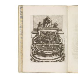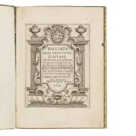 RARA E SPLENDIDA GALLERIA DI FONTANE ROMANE disegnate e incise da Domenico Parasacchi, ampliata da nuove tavole incise da Pietro Miotte su disegni di Girolamo Felice. Queste ultime si distinguono si distinguono facilmente dalle originali di Parasacchi perché sono eseguite in uno stile molto più materico e spesso includono figure impegnate in vari giochi e passatempi. Edizione priva di dati editoriali, ma si presume sia quella del 1647 stampata dal De Rossi visto che il frontespizio mantiene la dicitura “Matteo Gregorio De Rossi D.D.D.” poi cancellata nell’edizione stampata da Carlo Losi nel 1773.