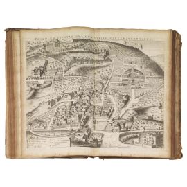 In folio (380 x 252 mm) in vitellino coevo molto danneggiato. Collazionato completo delle 25 tavole fuori testo (di cui 12 doppie e una più volte ripiegata) elencate nell’indice (carta chi1 menzionata come “variante C” su SBN), cui va sommata l’antiporta, anch’essa fuori testo; sono comprese nella collazione il ritratto di Clemente X e un’ulteriore tavola a piena pagina. Il numero totale di tavole a piena/doppia pagina/ripiegate è 28. Le altre numerose illustrazioni calcografiche sono testuali. Uniformemente ingiallito con frequenti fioriture e bruniture. Ex libris Marchionis Dusmet.