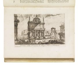 Prima edizione del supplemento autonomo alla “Descrizione topografica delle antichità di Roma” pubblicato nel 1763. Delle 54 lastre di rame, una trentina sono di Piranesi, che (secondo H. Focillon) furono realizzate nel 1748 e rappresentano quindi un'opera giovanile.