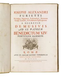 In 4to grande (285 x 204 mm). xvi 130 [2] pp. e 6 tavole calcografiche (du cui 4 ripiegate). Frontespizio in rosso e nero con piccola vignetta calcografica con stemma di Benedetto XIV, iniziali calcografiche. Pergamena rigida coeva con tassello dorato al dorso, tagli spruzzati di rosso. -- Minime fioriture e altre trascurabili tracce del tempo.