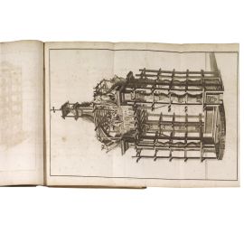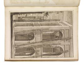 PRIMA EDIZIONE di questo splendido trattato dedicato alle macchine ideate dall’inventore, ingegnere e maestro muratore Nicola Zabaglia (1664-1750) per affrontare ogni tipo di lavoro edilizio dal trasporto del marmo agli interventi sotto alle cupole di San Pietro. La parte testuale, in italiano e poi in latino, si apre con la vita e le opere di Nicola Zabaglia, seguita da una descrizione analitica del contenuto di ogni tavola. Le tavole iniziali illustrano strumenti da lavoro (martelli, seghe, trivelle, molle, ecc.), funi e nodi, come aggiuntare travi, tipi di traglie; macchine come argani, antenne, castelli; modi di allungare le scale e ponteggi; ornamentazione di pavimenti. Le tavole successiva sono dedicate a lavori pesanti come il trasporto del marmo dalle cave, la collocazione delle campane, l’inserzione di un grande dipinto in una nicchia. Seguono illustrazioni di svariati tipi di ponteggi in San Pietro e nelle sue cupole (alcuni anche molto complessi), e poi tavole dedicate all’erezione dell’obelisco vaticano, inclusa un’immagine davvero straordinaria che mostra l’immenso schieramento di forze umane ed animali utilizzate nell’impresa. Le incisioni, estremamente dettagliate e nitide, rendono bene il senso della vastità degli spazi e della complicatezza delle strutture ideate da Zabaglia, conferendo all’opera un’atmosfera che porta alla mente quella di certi disegni di Escher.